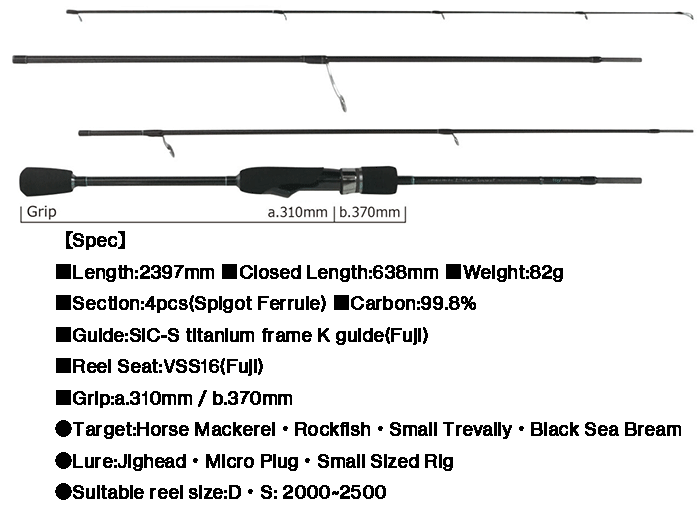 It features a highly balanced blank design that focuses on the harmony of flexibility and repulsive force. In long distance casting games using sinkers and Carolina rigs, you will be able to feel for slight changes in the current and sense the smallest of nibbles through the blank, and swiftly hook your target. It has excellent lure maneuverability and is versatile enough to handle top/bottom bream fishing and even light rock fish games. This is a rod that allows you to enjoy a variety of situations and targets.